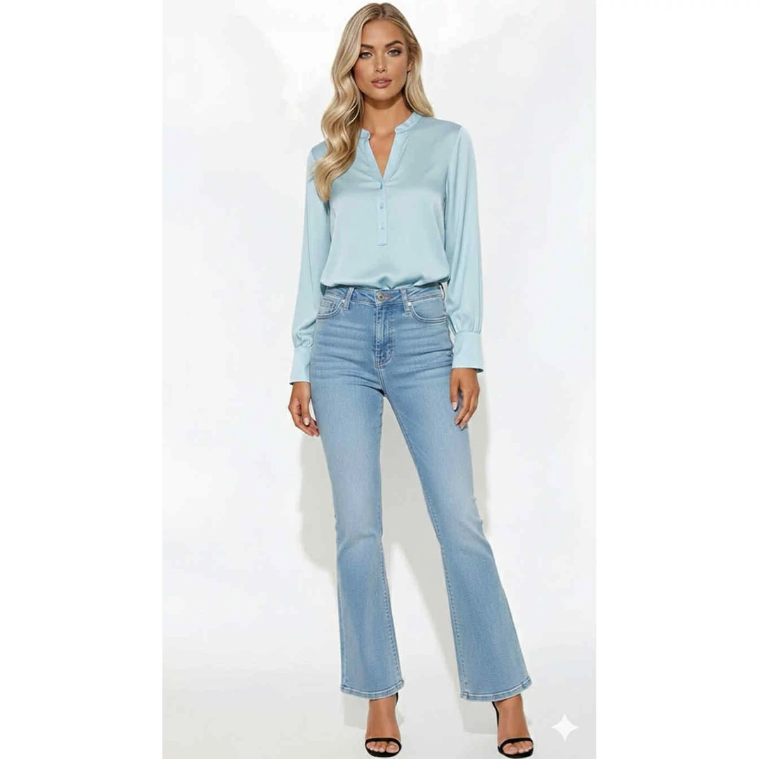 Elegáns, világoskék elöl gombos blúz